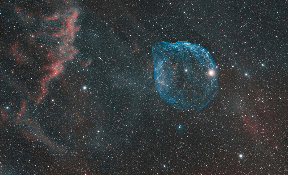 作品简介:拍摄目标是一团由炽热大质量恒星的高速恒星风所吹出的宇宙气泡,极为庞大。位于大犬座方向,离我们约有5,000光年远,遮盖的天区稍大于满月。