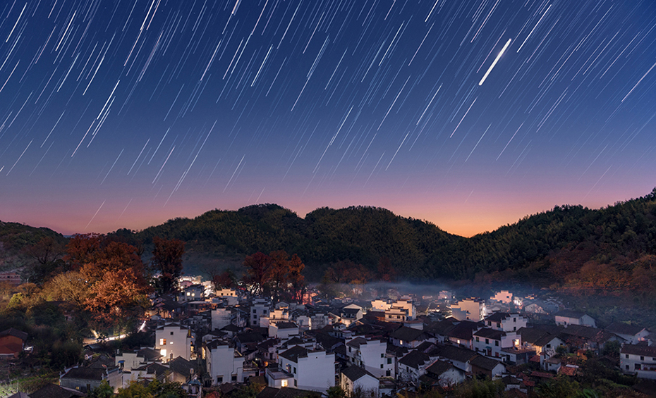 作品简介:深秋凌晨,天边渐渐泛起浅红,淡淡晨雾中点点亮起的灯光,映衬着天幕上的颗颗星辰。星点流转的此刻,我们与宇宙、自然悄然相融了。